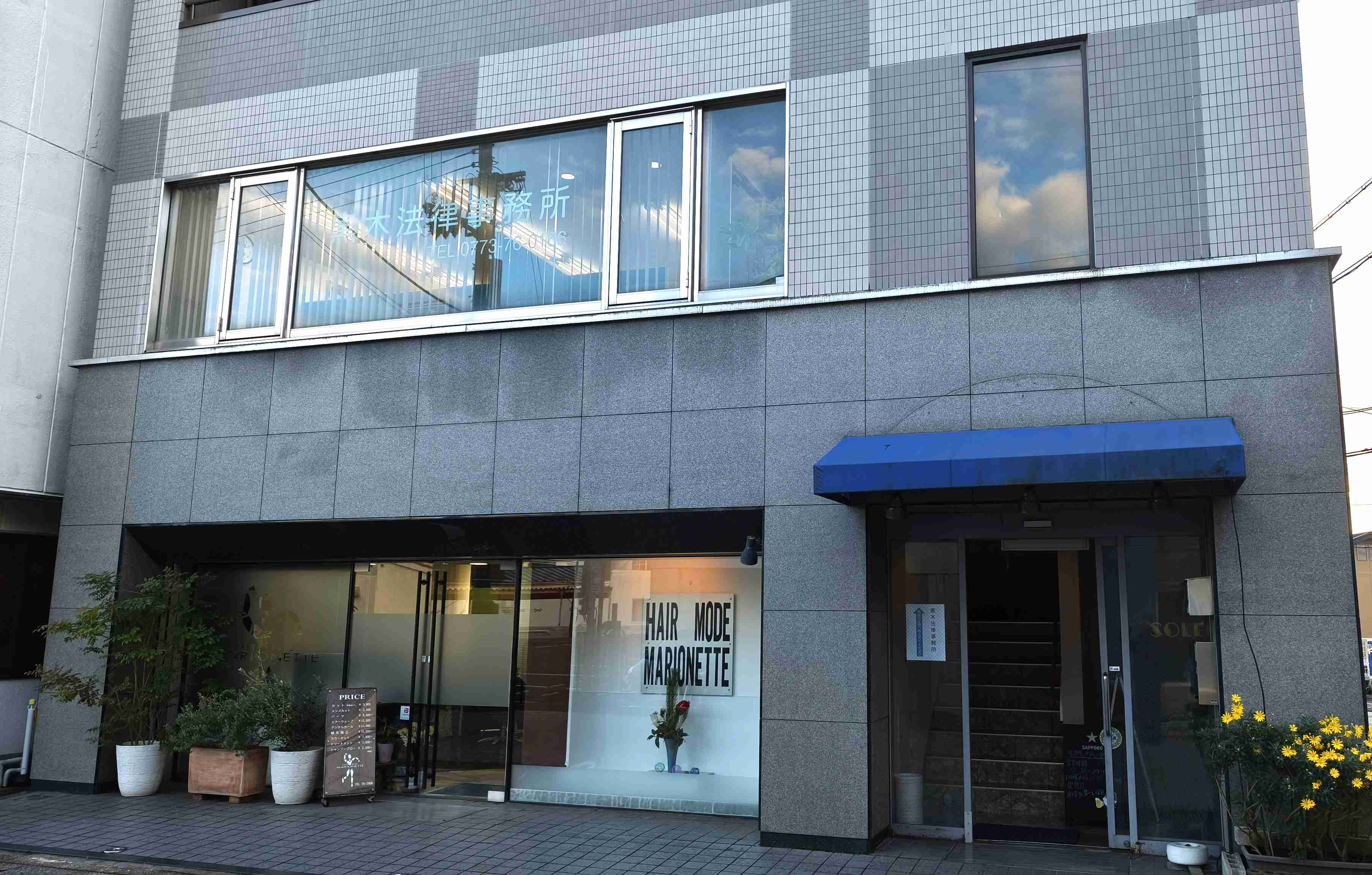 ビル北側出入口の階段をご利用ください。 1階は美容室マリオネット様、2階の奥(南側)は居酒屋それいゆ様です。